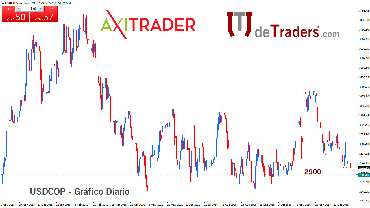 El USDCOP en gráfico diario, se encuentra trabajando el soporte de los $2.900 pesos colombianos por dólar estadounidense, esta es una zona óptima para estar atentos y tomar decisiones en el mercado.