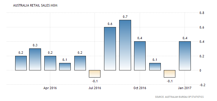 Los analistas acertaron en sus estimaciones, y el volumen desestacionalizado de las ventas minoristas subió un 0.4% en enero del 2017, después de una caída de 0.1% en diciembre del año pasado, informó el lunes la Oficina Federal de Estadística Australiana. Las ventas minoristas, son un indicador utilizado por los inversionistas para medir el gasto del consumidor, que representa más de la mitad del Producto Interno Bruto (PIB) de Australia.